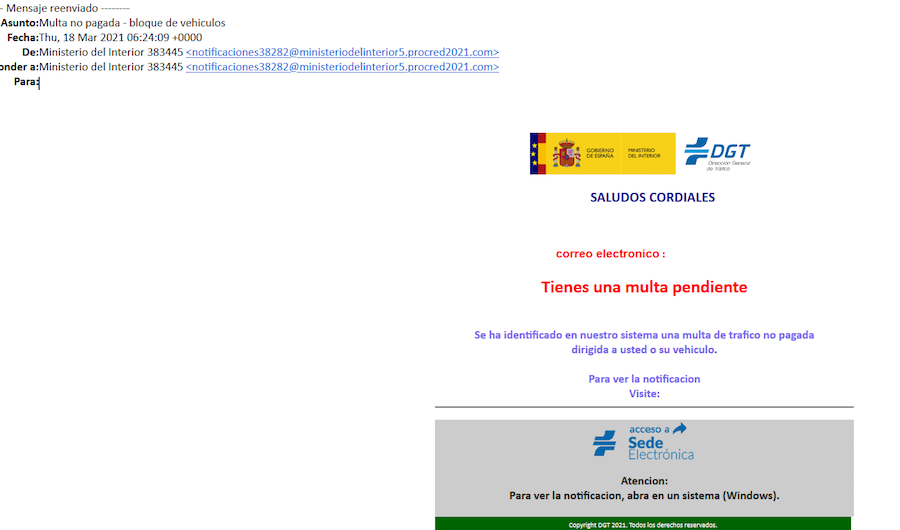 El mensaje se recibe desde la dirección de correo electrónico Esta dirección de correo electrónico está siendo protegida contra los robots de spam. Necesita tener JavaScript habilitado para poder verlo., identificándose el emisor como “Ministerio del Interior 383445”, y suplantando la imagen del Ministerio del Interior y de la Dirección General de Tráfico.